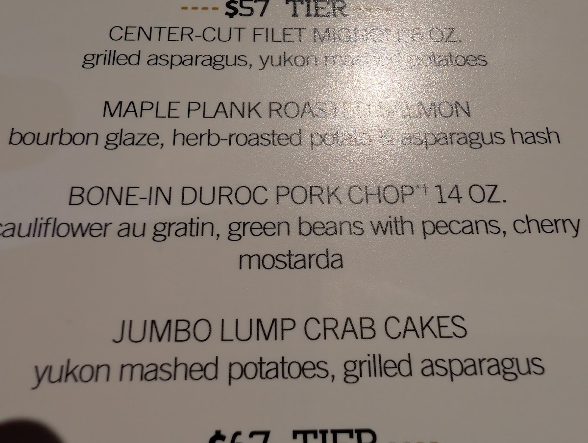 Sides such as creamed corn with bacon, grilled asparagus, and lobster mac and cheese offer rich, comforting complements to the main dishes. For dessert, selections like crème brûlée or velvet chocolate cake with raspberry ice cream provide a satisfying finish without overwhelming the palate.